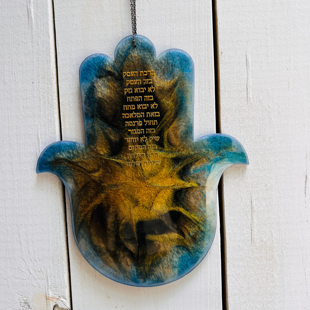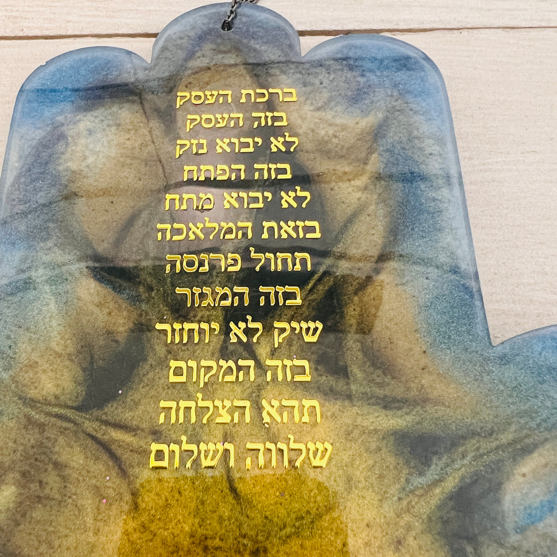 Large Gold & Blue Epoxy Hamsa with Gold Blessing for a Business (Heb)